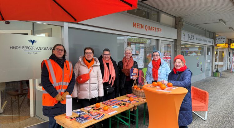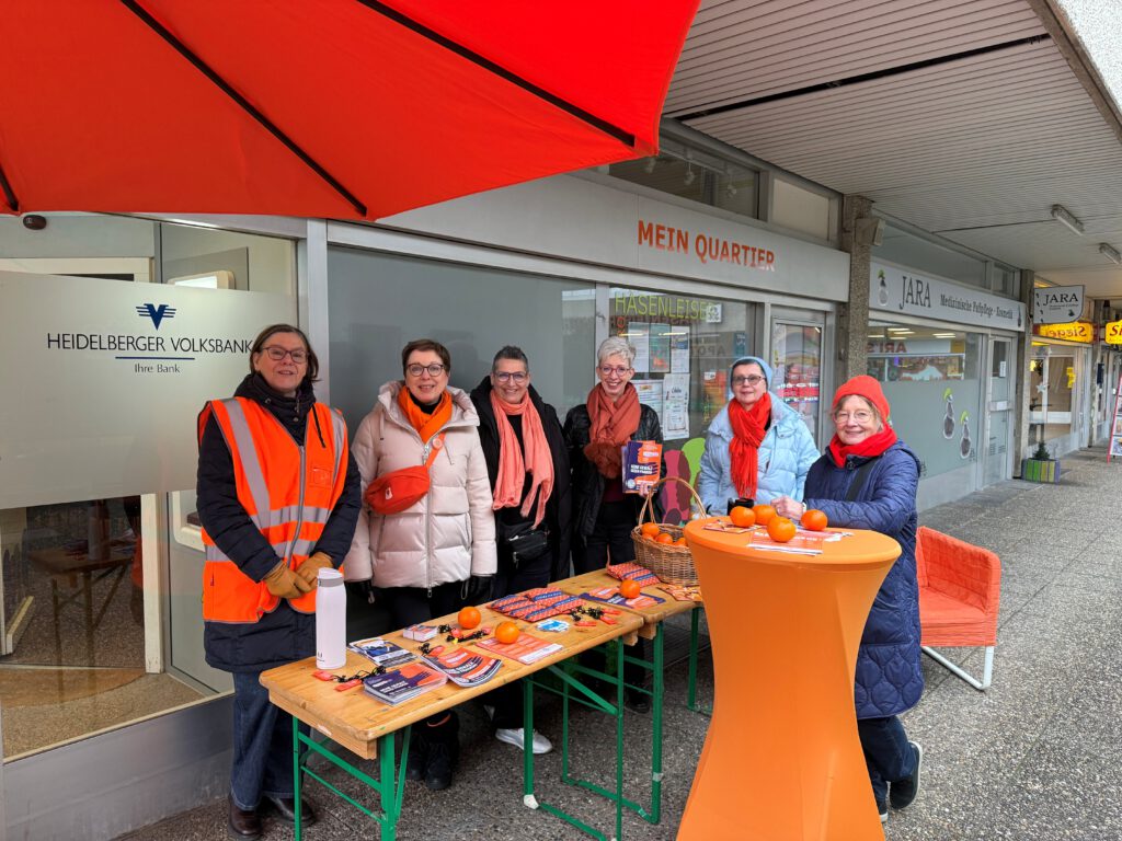 Im Rahmen der internationalen Kampagne zu den Orange Days setzten wir im Hasenleiser ein deutliches Zeichen gegen Gewalt an Frauen und Mädchen. Das Frauennetzwerk Soroptimist bot am 6. Dezember von 10 bis 13 Uhr einen Aktionsstand zum Thema „Gewalt gegen Mädchen und Frauen“ an. Direkt vor unserem Quartiersbüro informierten die Akteur*innen über Präventions- und Hilfsangebote in Heidelberg und standen für Gespräche zur Verfügung.