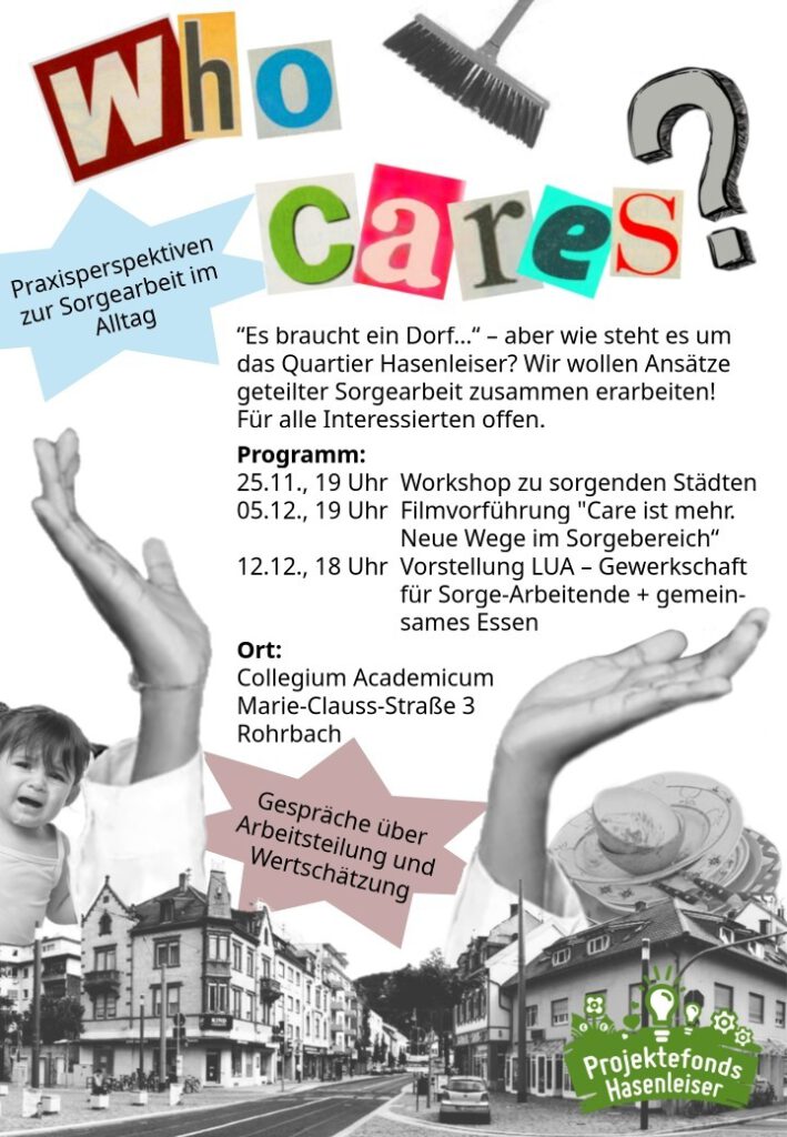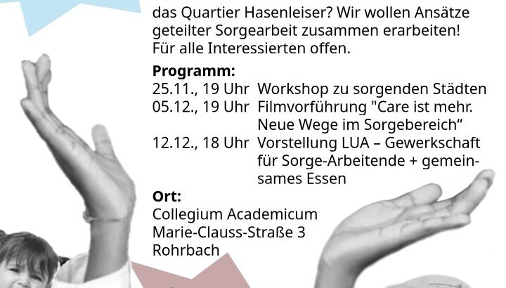 Wir wollen über Care-Arbeit (Sorge-Arbeit) reden! Ganz konkret hier vor Ort: Am Beispiel des Quartiers Hasenleiser wollen wir Praxisperspektiven zu Care-Arbeit im Alltag erarbeiten.